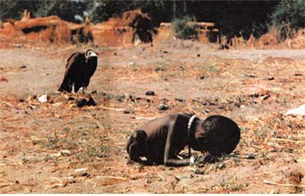 지난 1993년 아프리카 수단에 기근으로 많은 사람들이 죽어갈 때였습니다. 남아공화국 출신의 사진기자인 케빈 카터(Kevin Carter)가 식료품 가게 근처를 지나가고 있었습니다. 식료품 가게는 텅텅 비워있는데 그 가게 앞에 한 굶주린 소녀가 쪼그리고 앉아 있고 몇 발자국 뒤에는 큰 독수리가 그 소녀를 응시하고 있었습니다. 카터는 그 장면을 놓칠세라 정신없이 카메라셔터를 눌러댔습니다.
