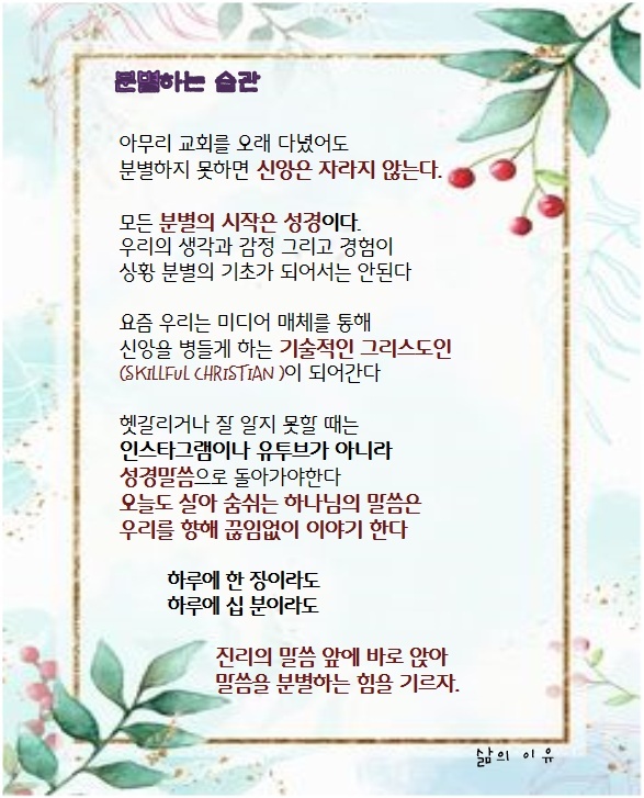 - 다음글12월 22일 탐욕을 버리고 성실과 충성으로 23.12.21