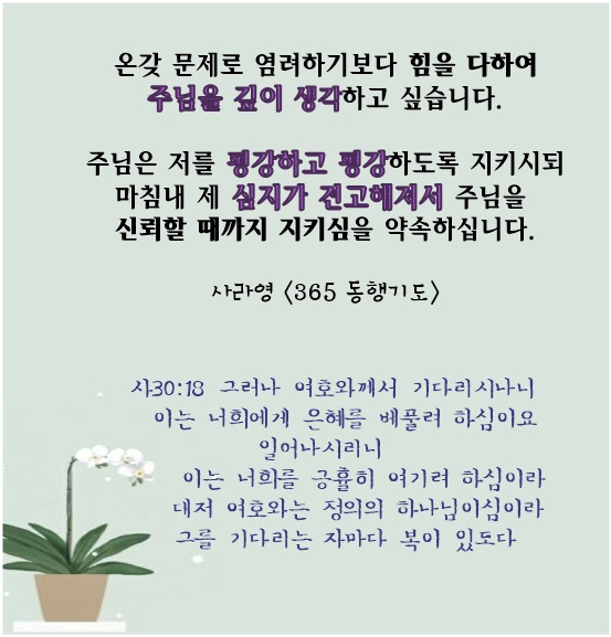 ※ 오늘의 기도: 아브라함과 야곱의 하나님! 육신의 호흡을 주시고 질병을 치유하시며, 구언을 주시는 주님의 이름을 높여 찬양합니다. 거룩하고 의로우신 주님을 생각하며 죄를 멀리 하게 하소서. 만물이 온전히 회복하는 날, 주님과 함께할 영원한 복락을 소망하며 오늘을 살게 하소서,