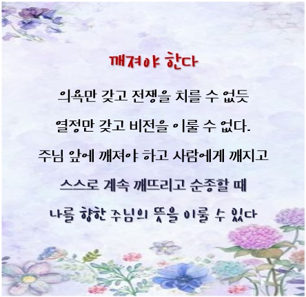 ※ 오늘의 기도: 교만한자를 낮추시는 하나님, 제 안에 있는 모든 교만을 버리고 주님만을 의지하게 하소서. “ 내가 거룩하니 너희도 거룩하라. ” 하신 말씀을 기억하며 죄악을 피하는 지혜를 간구합니다 공의를 따라 상주시는 그날에 착하고 충성되다 칭찬 받는 자녀 되게 하소서.
