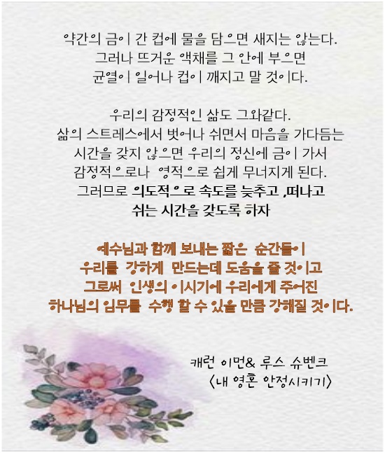 ※ 오늘의 기도: 하나님, 전쟁터 같은 삶의 현장에서 저를 하나님의 강한 군사로 훈련하시며 하나님과 함께 승리 할 수 있음을 가르쳐 주시니 감사합니다. 하나님을 의지함으로 모든 두려움과 현실의 장벽을 뛰어넘게 하소서. 주위 사람들에게 하나님의 사랑과 구원의 은혜를 담대히 간증하게 하소서.