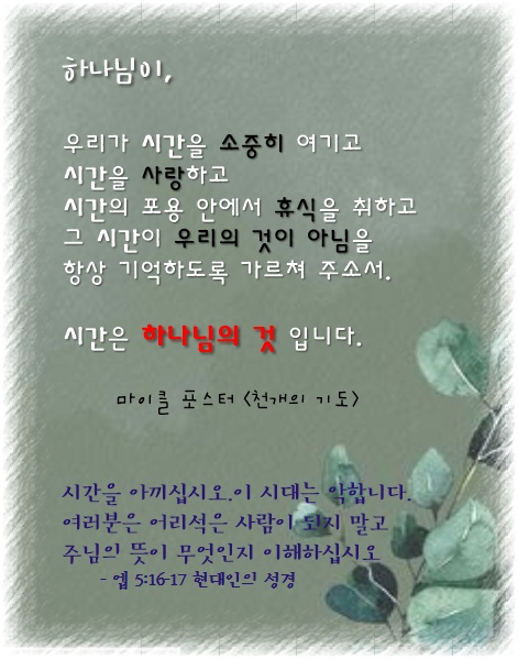 ※ 오늘의 기도: 하나님, 제 이익과 상황에 유리하게 하나님의 뜻을 끼워 맞추려 했던 악함을 고백합니다. 아무리 선한 목적이라도 누군가 마음이 상하지 않는지 살피며 끝까지 하나님 뜻에 집중하게 하소서, 각 사람 인생을 이끄시는 하나님의 놀라운 섭리를 볼수 있도록 제 눈을 얄어 주소서,