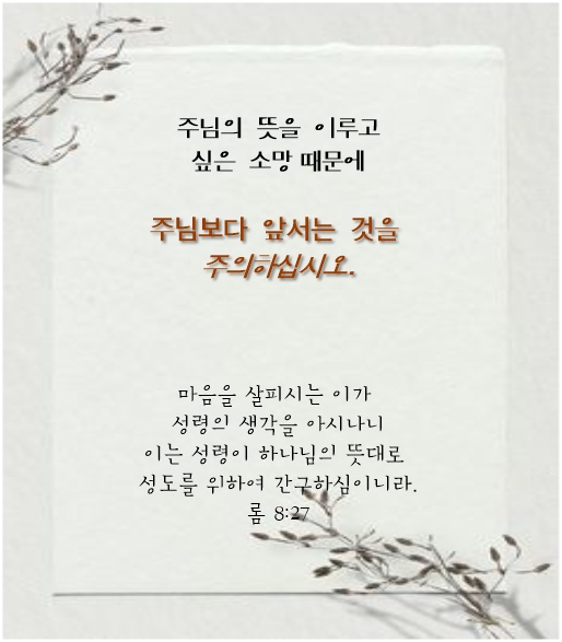 날마다 정결하게 하시는 말씀의 샘으로 나아가 차오르는 욕심과 분노를 씻게 하소서. 삶을 세밀히 도우시는 하나님 약속을 의지하며,