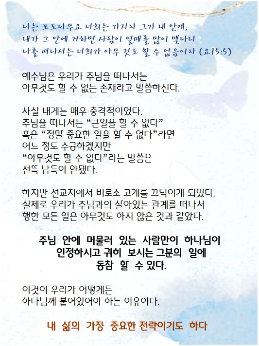 ※ 오늘의 기도: 하나님, 혼자 남겨진 외로움과 생명을 조여 오는 두려움 속에서도 하나님의 안전한 품을 기억하게 하소서.