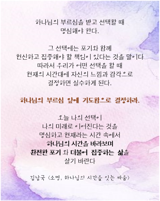 ※ 오늘의 기도: 왕이신 하나님, 제 삶을 드려 하나님만을 높이고 섬기기를 원합니다. 세상 논리와 매력에 현혹되지 않고, 하나님의 뜻을 기준으로 삼아 따르게 하소서. 작은 선택의 순간에도 하나님을 기억하게 하시고, 하나님의 통치를 신뢰하며 모든 일을 성실히 감당하게 하소서.