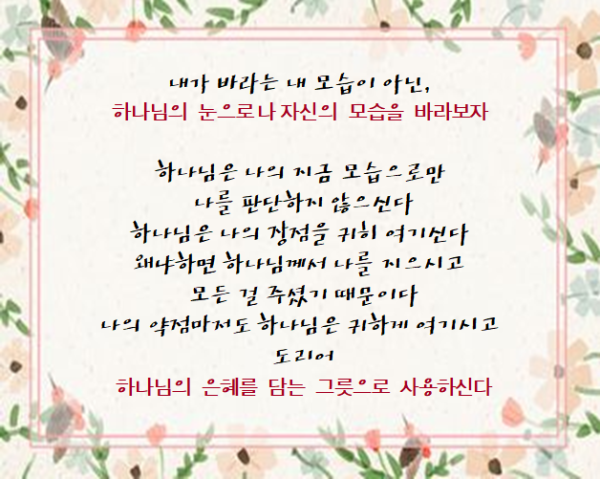 사랑은 오래참고 사랑은 온유하며 시기하지 아니하며 사랑은 자랑하지 아니하며 교만하지 아니하며 (고전 13:4)