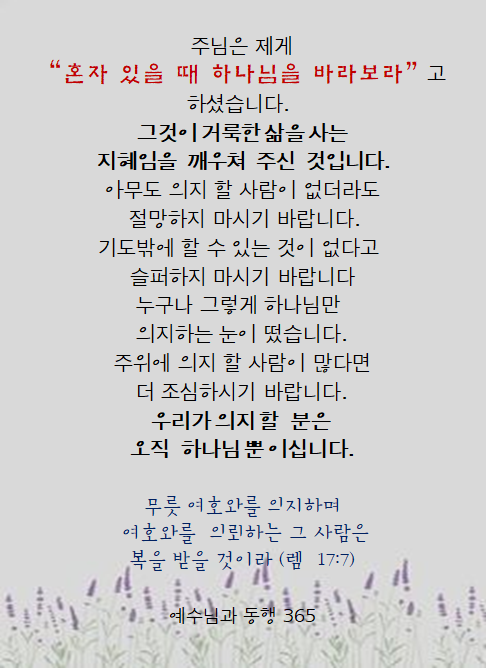 October 25, 2022 . 아름다운동산교회 10/25 매일 묵상 페이지 정보 작성자 아름다운동산교회 댓글 0건 조회 1,626회 작성일 22-10-25 08:18 목록 본문 구하오니 주의 종에게 하신 말씀대로 주의 인자하심이 나의 위안이 되게 하시며 (시 119:76)May your unfailing love be my comfort, according to your promise to your servant. 이전글10/27 매일묵상 22.10.27 다음글10/24 매일 묵상 22.10.23 목록