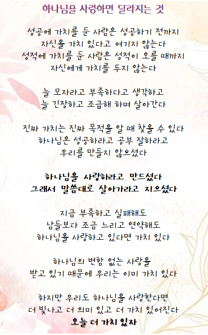September 04, 2022 . 아름다운동산교회 9/4 매일 묵상 페이지 정보 작성자 아름다운동산교회 댓글 0건 조회 1,648회 작성일 22-09-04 04:31 목록 본문 주께서 그 사랑하시는 자를 징계하시고 그가 받아들이시는 아들마다 채찍질하심이라 하였으니 (히 12:6) because the Lord disciplines those he loves, and he punishes everyone he accepts as a son. 이전글9/5 매일 묵상 22.09.05 다음글9/3 매일 묵상 22.09.02 목록