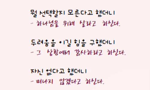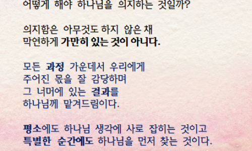 본문 : 왕하 7:11-20 본문에서는 이스라엘 백성을 끝까지 버리지 아니하시고 구원하신다는 내용이 두드러지게 부각되고 있습니다. 그리고 하나님의 구원은 완전하고 풍성하다는 것을 보여줍니다. 아름다운 소식(9-11) 문둥병자들은 동족 사마리아인들에 대한 그들의 의무감을 깨닫고 죄의식을 느꼈습니다. 그들은 자신들의 욕심만 채운 죄책감 가운데 살기보다는동족들과 함께 구원받을 생각을 했습니다. 그래서 그들은 이 기쁜 소식을 가지고 빠른 걸음으로 사마리아성으로 향하였습니다. 그 소식은 성 문지기에게 전해지고 곧왕에게까지 전해졌습니다. 우리는 자신과 인류에게 행복과 영생을 줄 수 있는 주 예수 그리스도의 복음을 어떻게 하십니까? 의심하는 여호람(12-15) 이 기쁜 소식을 접한 이스라엘 왕 여호람은 함정일 것이라고 의심했습니다. “시리아 사람들이 우리에게 이렇게 한 것이 무슨 뜻이겠소. 내생각에는, 그들이 분명 우리가 못 먹어 허덕이는 줄 알고 진영을 비우고 들에 숨어있다가, 우리가 성 밖으로 나오면 우리를 생포하고, 이 성 안으로 쳐들어오려고 생각한 것 같소.”라고 말했습니다. 그러자 신하 중의 하나가 이렇게 제안합니다. “이 성안에 아직 남아 있는 다섯 필의 말은, 이 성 안에 남아 있는 이스라엘 모든 사람의 운명과 마찬가지로 어차피 굶어 죽고야 말 것이니, 이 말에 사람을 태워 보내어서, 정찰이나 한번 해 보시는 것이 어떻겠습니까?” 그는 그 제안을 받아 들여 아람군의 뒤를 쫓아 요단 강까지 가보도록 했습니다. 길에는 병사들이 급히 도망치다가 던져 버린 의복과 군장비만 가득했습니다. 이것을 보고 받은 왕은 비로소 믿고백성을 이끌고 성 밖으로 나왔습니다. 성취된 예언(16-20) 왕은 식량과 노획물을 찾으러 계속해서 성 밖으로 몰려 나가는 흥분한 군중들을 위해 분명히 성문을 활짝 열어 놓았을 것입니다. 온 백성은 구원의 기쁨과 배부름의 충족을 맛보았고 먼저 식량을 확보한 사람들은 엘리사가 예견했던 것과 같은 가격으로 그들의 이웃들에게 파는 상거래를 형성하였습니다. 좁은성문이 밀려드는 백성들로 인해 너무나 복잡해지자 왕을 보좌하던 장관이 그곳을 질서 있게 통제하기 위하여 머물러 있다가 이성을 잃은 백성들에게 짓밟혀 죽었습니다. 이 사람은 엘리사를 통하여 하나님이 하신 말씀 즉 이스라엘을 구원하고 싼 값에 양식이 거래가 되리라는 말씀을 멸시하므로 그가 그 축복을 누리지 못하고 짓밟혀 죽으리라는 예언대로 된 것입니다.