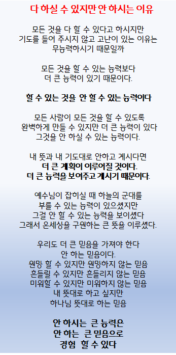 April 06, 2022 . 아름다운동산교회 4/6 매일 묵상 페이지 정보 작성자 아름다운동산교회 댓글 0건 조회 1,975회 작성일 22-04-06 04:40 목록 본문 사람의 걸음은 여호와로 말미암나니 사람이 어찌 자기의 길을 알 수 있으랴(잠 20:24) Man's goings are of the Lord; how can a man then understand his own way? 이전글4/7 매일 묵상 22.04.07 다음글4/5 매일 묵상 22.04.05 목록