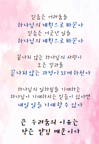 February 04, 2022 . 아름다운동산교회 2/4 매일 묵상 페이지 정보 작성자 아름다운동산교회 댓글 0건 조회 2,190회 작성일 22-02-04 07:00 목록 본문 "지존자여 십현금과 비파와 수금으로 여호와께 감사하며 주의 이름을 찬양하고 아침마다 주의 인자하심을 알리며 밤마다 주의 성실하심을 베풂이 좋으니이다 ." (시편 92:1-3절) 이전글2/05 매일묵상 22.02.05 다음글2/3 매일 묵상 22.02.03 목록