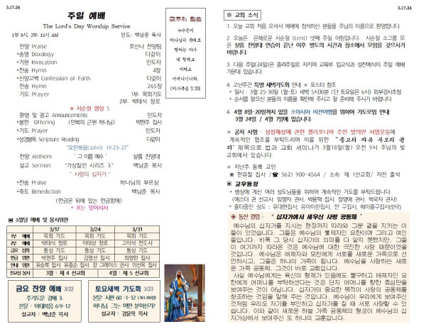 03/17/24 교회 주보 페이지 정보 작성자 아름다운동산교회 댓글 0건 조회 2,450회 작성일 24-03-16 06:43 목록 본문 03/17/24 이전글03/24/24 교회 주보 24.03.23 다음글03/10/24 교회 주보 24.03.09 댓글 0 댓글목록 등록된 댓글이 없습니다. 목록