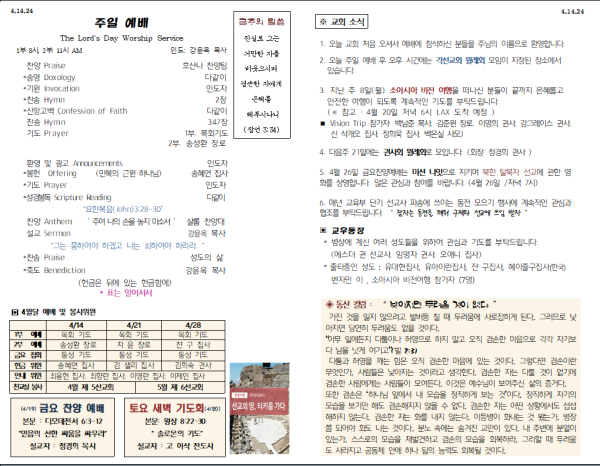 4월 14일 주일 주보 페이지 정보 작성자 아름다운동산교회 댓글 0건 조회 2,004회 작성일 24-04-07 15:37 목록 본문 4/14 주일 주보 이전글04/21/24 교회 주보 24.04.21 다음글04/07/24 교회 주보 24.04.06 댓글 0 댓글목록 등록된 댓글이 없습니다. 목록