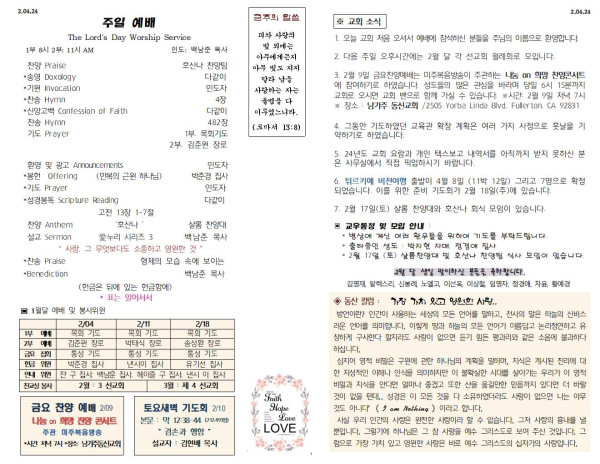 02/04/24 교회 주보 페이지 정보 작성자 아름다운동산교회 댓글 0건 조회 1,665회 작성일 24-02-03 08:15 목록 본문 02/04/24 이전글02/11/24 교회 주보 24.02.09 다음글1/28/24 교회 주보 24.01.27 댓글 0 댓글목록 등록된 댓글이 없습니다. 목록