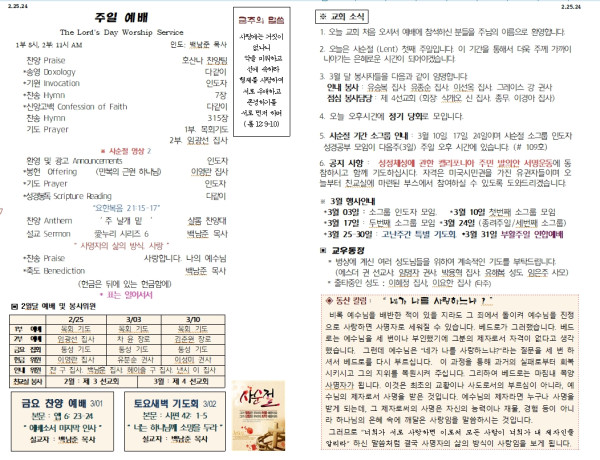 2/25/24 교회주보 페이지 정보 작성자 아름다운동산교회 댓글 0건 조회 1,932회 작성일 24-02-24 08:00 목록 본문 2월 25일 주일 주보 이전글03/03/24 교회 주보 24.03.02 다음글2월 18일 교회주보 24.02.16 댓글 0 댓글목록 등록된 댓글이 없습니다. 목록