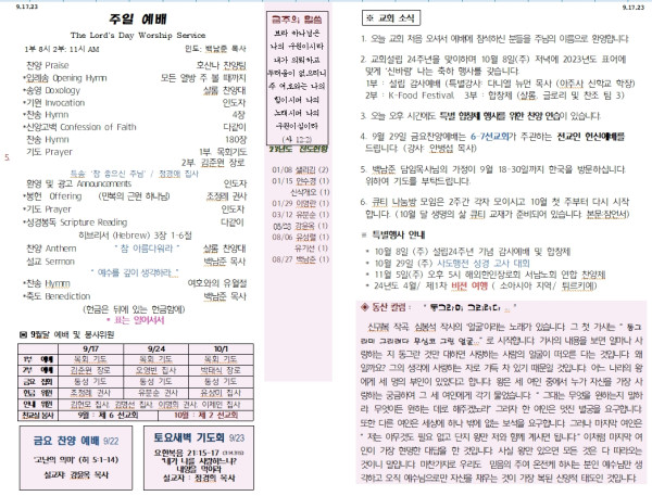 09-17-23 교회 주보 페이지 정보 작성자 아름다운동산교회 댓글 0건 조회 2,786회 작성일 23-09-16 07:36 목록 본문 09-17-23 이전글09-24-23 교회 주보 23.09.17 다음글9월 10일 주보 23.09.09 댓글 0 댓글목록 등록된 댓글이 없습니다. 목록