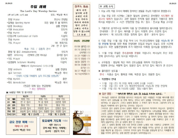 10/29/23 교회 주보 페이지 정보 작성자 아름다운동산교회 댓글 0건 조회 2,461회 작성일 23-10-28 07:15 목록 본문 10/29/23 이전글11/5/23 교회 주보 23.11.04 다음글10/22/23 교회 주보 23.10.21 댓글 0 댓글목록 등록된 댓글이 없습니다. 목록