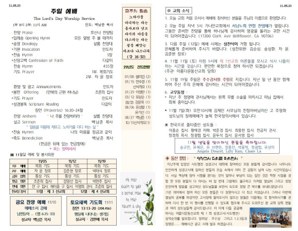 11/5/23 교회 주보 페이지 정보 작성자 아름다운동산교회 댓글 0건 조회 2,263회 작성일 23-11-04 09:18 목록 본문 11/5/23 이전글11/12/23 교회 주보 23.11.11 다음글10/29/23 교회 주보 23.10.28 댓글 0 댓글목록 등록된 댓글이 없습니다. 목록