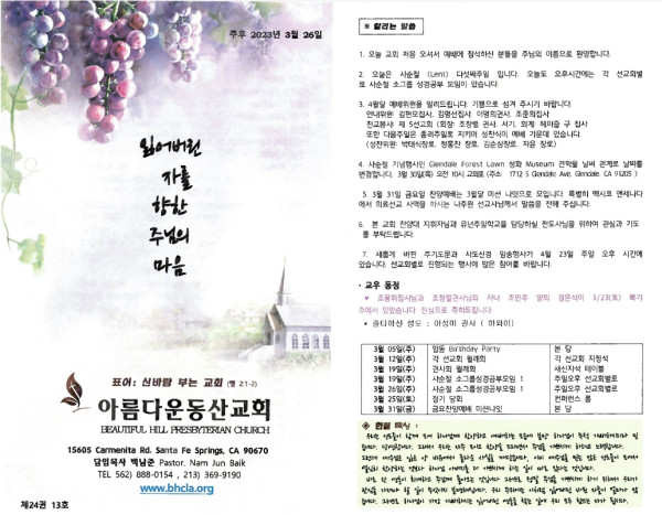 03/26/23 교회 주보 페이지 정보 작성자 아름다운동산교회 댓글 0건 조회 2,005회 작성일 23-03-26 09:05 목록 본문 03/26/23 이전글04/02/23 교회 주보 23.04.01 다음글03/19/23 교회 주보 23.03.18 댓글 0 댓글목록 등록된 댓글이 없습니다. 목록