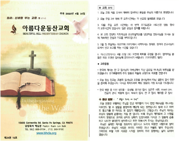 04/16/23 교회 주보 페이지 정보 작성자 아름다운동산교회 댓글 0건 조회 2,507회 작성일 23-04-15 07:23 목록 본문 04/16/23 이전글04-23-23 교회 주보 23.04.22 다음글04-09-23 교회 주보 23.04.08 댓글 0 댓글목록 등록된 댓글이 없습니다. 목록