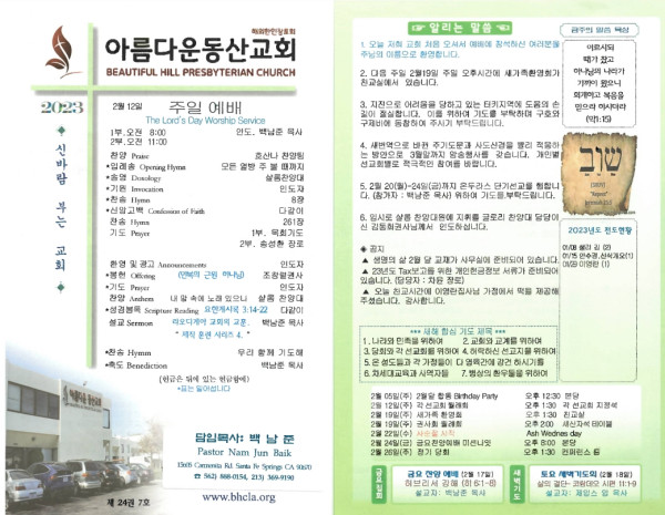 02/12/23 교회 주보 페이지 정보 작성자 아름다운동산교회 댓글 0건 조회 2,017회 작성일 23-02-11 10:32 목록 본문 02/12/23 이전글02/19/23 교회 주보 23.02.18 다음글02/05/23 교회 주보 23.02.04 댓글 0 댓글목록 등록된 댓글이 없습니다. 목록