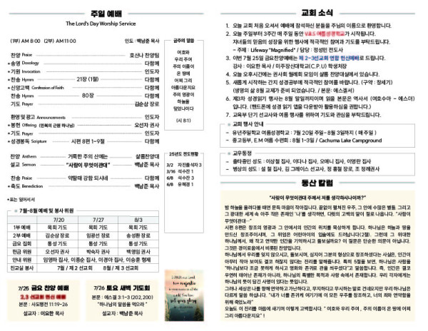 07/20/25 교회 주보 페이지 정보 작성자 아름다운동산교회 댓글 0건 조회 413회 작성일 25-07-19 06:56 목록 본문 07/20/25 이전글07/27/25 교회 주보 25.07.26 다음글07/13/25 교회 주보 25.07.12 댓글 0 댓글목록 등록된 댓글이 없습니다. 목록