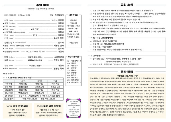 10/19/25 교회 주보 페이지 정보 작성자 아름다운동산교회 댓글 0건 조회 7회 작성일 25-10-25 07:21 목록 본문 10/19/25 교회 주보 이전글10/26/25 교회 주보 25.10.25 다음글10/12/25 교회 주보 25.10.11 댓글 0 댓글목록 등록된 댓글이 없습니다. 목록