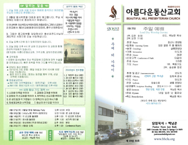 08/28/22 교회 주보 페이지 정보 작성자 아름다운동산교회 댓글 0건 조회 2,118회 작성일 22-08-27 07:54 목록 본문 08/28/22 이전글09/04/22 교회 주보 22.09.03 다음글08/21/22 교회 주보 22.08.20 댓글 0 댓글목록 등록된 댓글이 없습니다. 목록