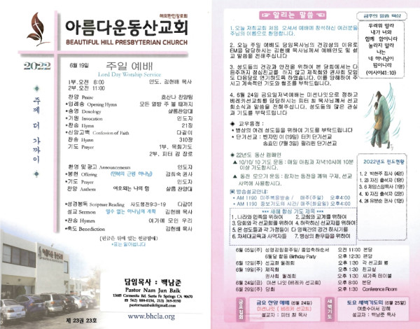 06/19/22 교회 주보 페이지 정보 작성자 아름다운동산교회 댓글 0건 조회 2,747회 작성일 22-06-19 09:00 목록 본문 06/19/22 이전글06/26/22 22.06.26 다음글06/12/22 교회 주보 22.06.19 댓글 0 댓글목록 등록된 댓글이 없습니다. 목록