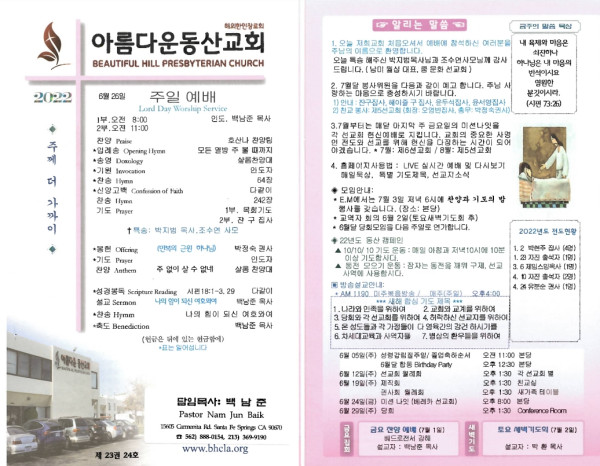 06/26/22 페이지 정보 작성자 아름다운동산교회 댓글 0건 조회 2,094회 작성일 22-06-26 12:25 목록 본문 06/26/22 이전글07/03/22 교회 주보 22.07.02 다음글06/19/22 교회 주보 22.06.19 댓글 0 댓글목록 등록된 댓글이 없습니다. 목록