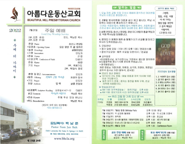 07/31/22 교회 주보 페이지 정보 작성자 아름다운동산교회 댓글 0건 조회 2,567회 작성일 22-07-30 07:21 목록 본문 07/31/22 이전글08/07/22 교회 주보 22.08.07 다음글07/24/22 교회 주보 22.07.23 댓글 0 댓글목록 등록된 댓글이 없습니다. 목록