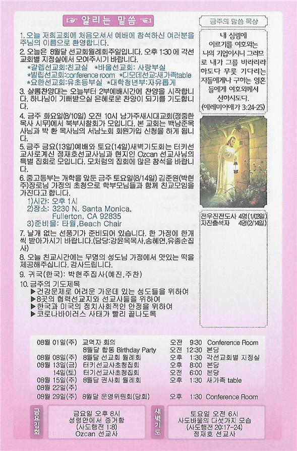 08/08/21 주일 교회 소식 페이지 정보 작성자 댓글 0건 조회 3,070회 작성일 21-08-07 00:00 목록 본문 이전글08/22/21 주일 교회 소식 21.08.21 다음글08/01/21주일 교회 소식 21.07.31 댓글 0 댓글목록 등록된 댓글이 없습니다. 목록