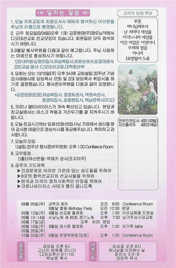 08/29/21 주일 교회 소식 페이지 정보 작성자 댓글 0건 조회 3,331회 작성일 21-08-28 11:52 목록 본문 이전글09/05/21 주일 교회 소식 21.09.04 다음글08/22/21 주일 교회 소식 21.08.21 댓글 0 댓글목록 등록된 댓글이 없습니다. 목록