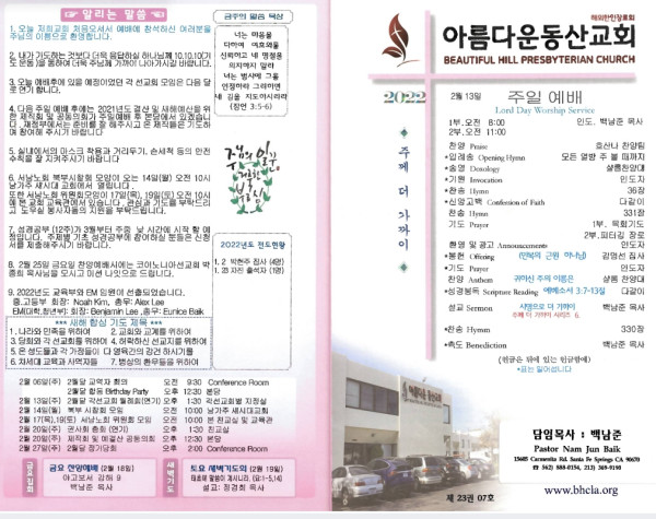 02/13/22 교회 주보 페이지 정보 작성자 아름다운동산교회 댓글 0건 조회 2,895회 작성일 22-02-12 10:17 목록 본문 02/13/22 이전글02-20-22 교회 주보 22.02.19 다음글2/6/22 교회 주보 22.02.05 댓글 0 댓글목록 등록된 댓글이 없습니다. 목록
