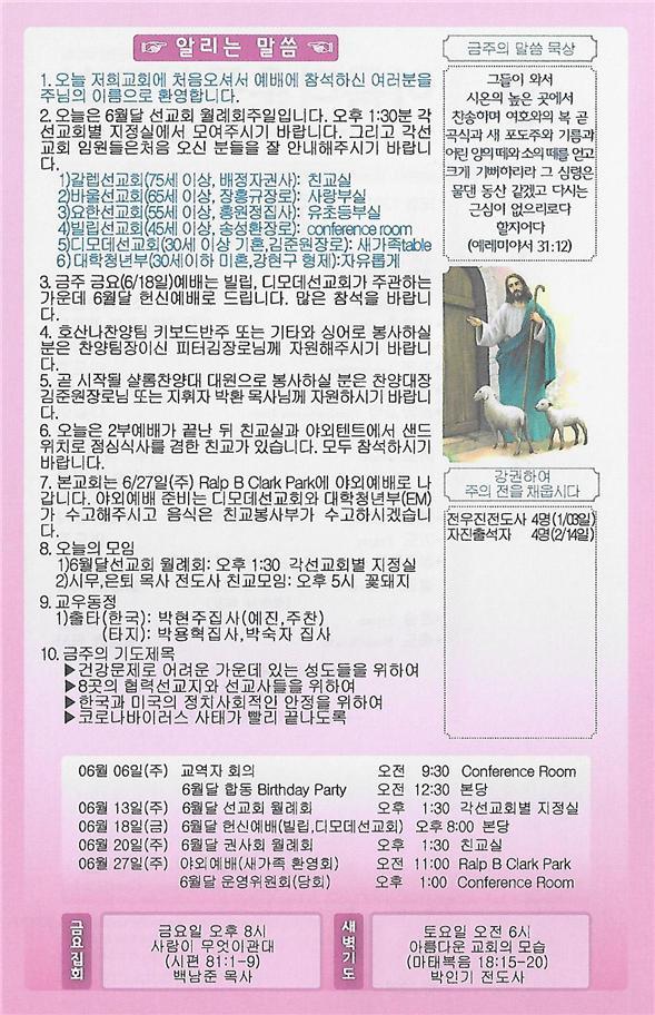 06/13/21 주일 교회 소식 페이지 정보 작성자 댓글 0건 조회 3,112회 작성일 21-06-12 11:07 목록 본문 이전글06/20/21 주일 교회 소식 21.06.19 다음글06/06/21 주일 교회 소식 21.06.05 댓글 0 댓글목록 등록된 댓글이 없습니다. 목록