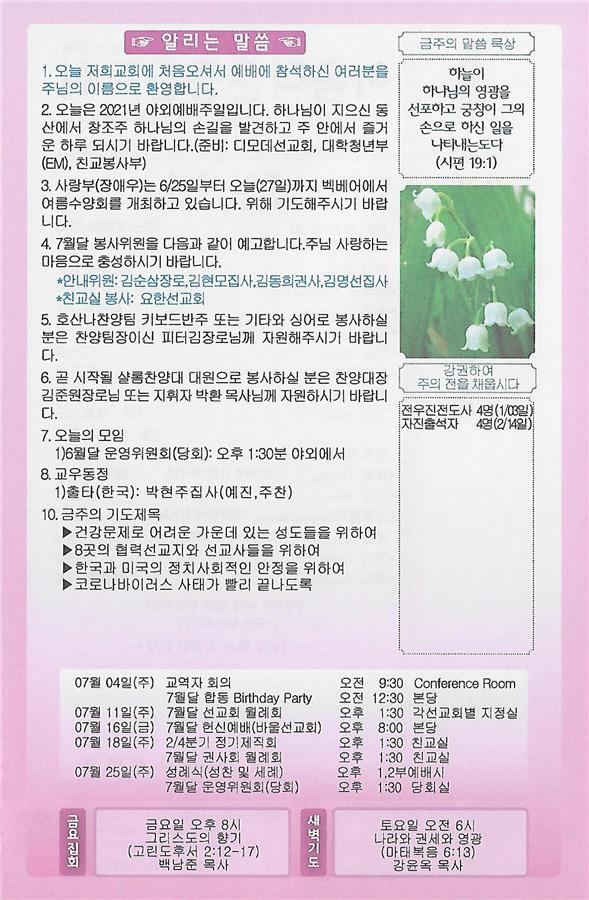06/27/21 주일 교회 소식 페이지 정보 작성자 댓글 0건 조회 3,152회 작성일 21-06-26 08:28 목록 본문 이전글07/04/21 주일 교회 소식 21.07.03 다음글06/20/21 주일 교회 소식 21.06.19 댓글 0 댓글목록 등록된 댓글이 없습니다. 목록