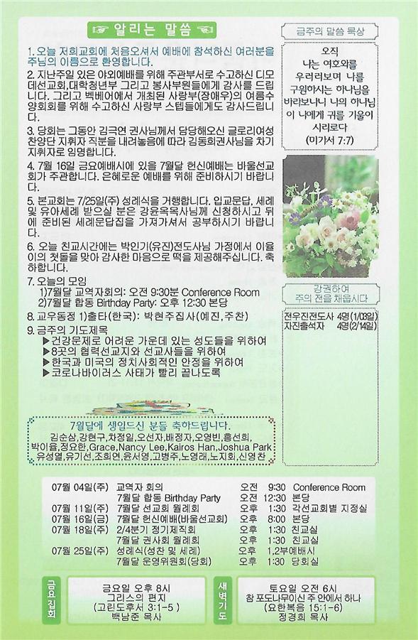 07/04/21 주일 교회 소식 페이지 정보 작성자 댓글 0건 조회 3,284회 작성일 21-07-03 00:00 목록 본문 이전글07/11/21 주일 교회 소식 21.07.10 다음글06/27/21 주일 교회 소식 21.06.26 댓글 0 댓글목록 등록된 댓글이 없습니다. 목록