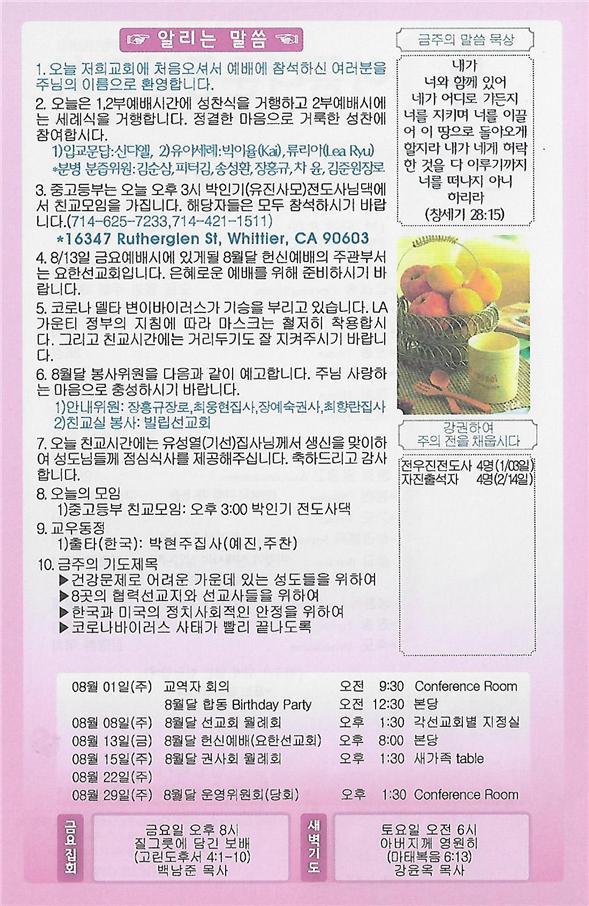 07/25/21 주일 교회 소식 페이지 정보 작성자 댓글 0건 조회 3,219회 작성일 21-07-24 11:48 목록 본문 이전글08/01/21주일 교회 소식 21.07.31 다음글07/18/21 주일 교회 소식 21.07.17 댓글 0 댓글목록 등록된 댓글이 없습니다. 목록