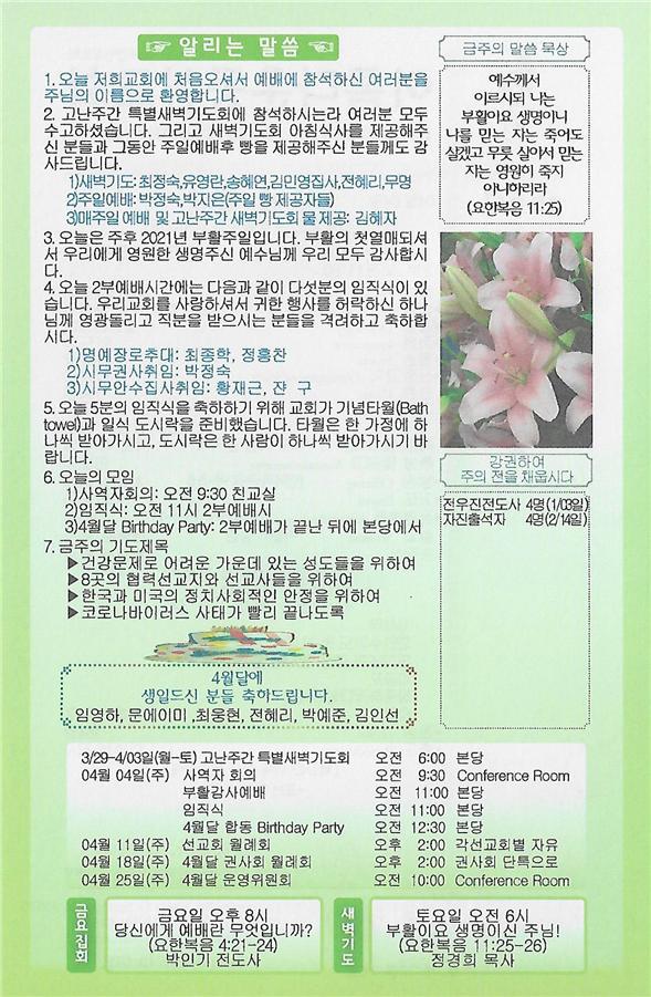 04/04/21 주일 교회 소식 페이지 정보 작성자 댓글 0건 조회 2,880회 작성일 21-04-03 11:55 목록 본문 이전글04/11/21 주일 교회 소식 21.04.10 다음글03/28/21 주일 교회 소식 21.03.27 댓글 0 댓글목록 등록된 댓글이 없습니다. 목록