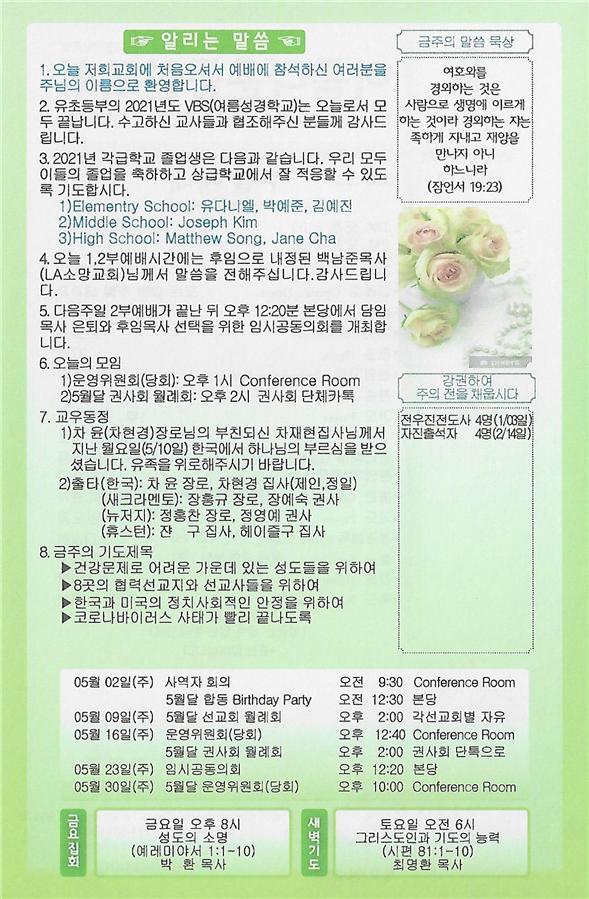 05/16/21 주일 교회 소식 페이지 정보 작성자 댓글 0건 조회 3,019회 작성일 21-05-15 12:26 목록 본문 이전글05/30/21 주일 교회 소식 21.05.29 다음글05/02/21 주일 교회 소식 21.05.01 댓글 0 댓글목록 등록된 댓글이 없습니다. 목록