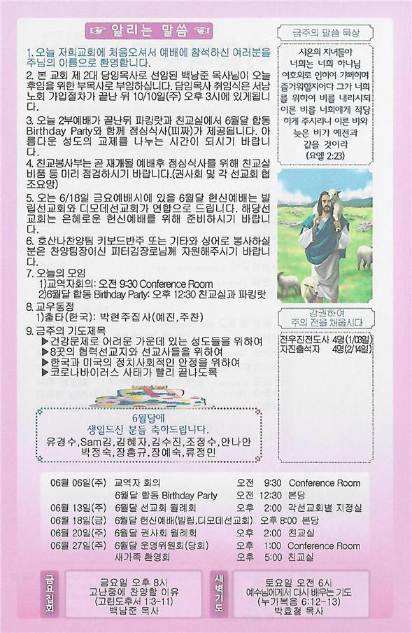 06/06/21 주일 교회 소식 페이지 정보 작성자 댓글 0건 조회 2,865회 작성일 21-06-05 10:29 목록 본문 이전글06/13/21 주일 교회 소식 21.06.12 다음글05/30/21 주일 교회 소식 21.05.29 댓글 0 댓글목록 등록된 댓글이 없습니다. 목록