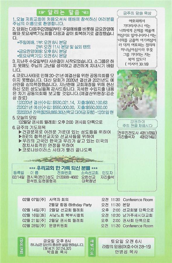 02/21/21 주일 교회 소식 페이지 정보 작성자 댓글 0건 조회 2,605회 작성일 21-02-20 00:00 목록 본문 이전글02/28/21 주일 교회 소식 21.02.27 다음글02/14/21 주일 교회 소식 21.02.13 댓글 0 댓글목록 등록된 댓글이 없습니다. 목록