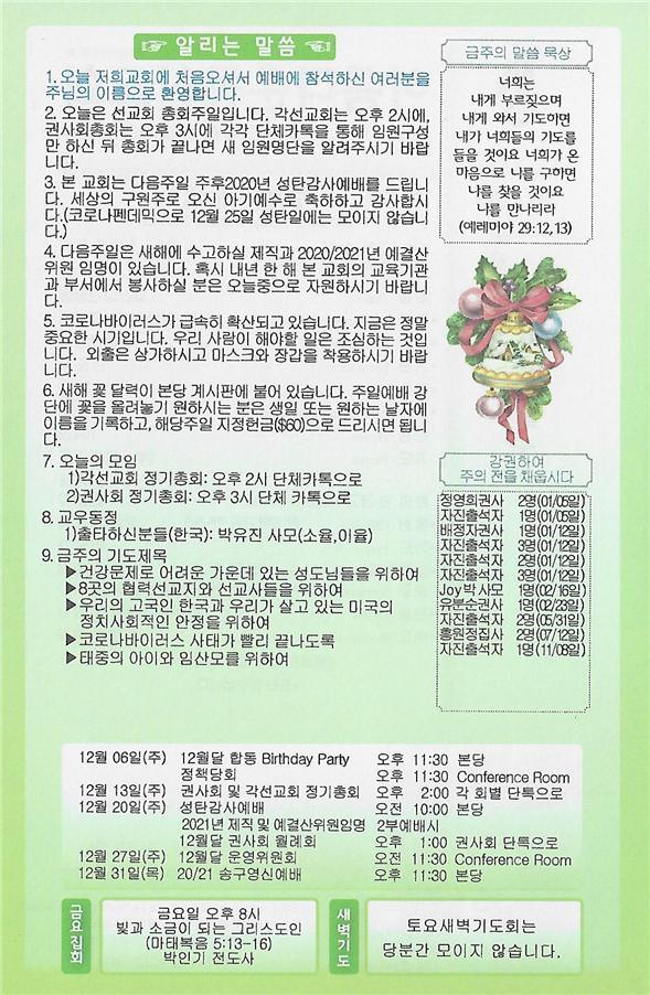 12/13/20 주일 교회 소식 페이지 정보 작성자 댓글 0건 조회 2,861회 작성일 20-12-12 20:00 목록 본문 이전글12/20/20 주일 교회 소식 20.12.19 다음글12/06/20 주일 교회 소식 20.12.05 댓글 0 댓글목록 등록된 댓글이 없습니다. 목록