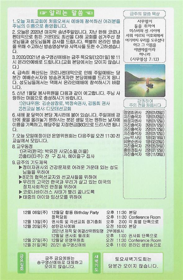 12/27/20 주일 교회 소식 페이지 정보 작성자 댓글 0건 조회 2,976회 작성일 20-12-26 08:14 목록 본문 이전글01-03-21 주일 교회 소식 20.12.31 다음글12/20/20 주일 교회 소식 20.12.19 댓글 0 댓글목록 등록된 댓글이 없습니다. 목록