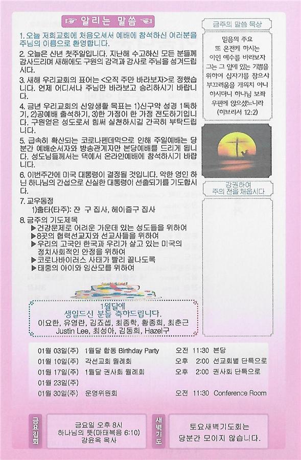 01-03-21 주일 교회 소식 페이지 정보 작성자 댓글 0건 조회 2,846회 작성일 20-12-31 08:53 목록 본문 이전글01-10-21 주일 교회 소식 21.01.08 다음글12/27/20 주일 교회 소식 20.12.26 댓글 0 댓글목록 등록된 댓글이 없습니다. 목록