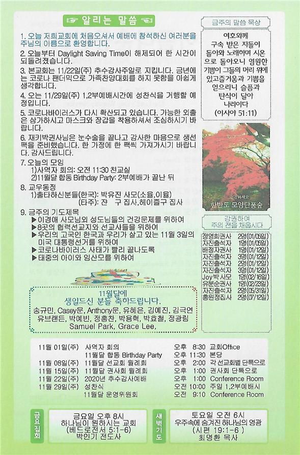11/01/20 주일 교회 소식 페이지 정보 작성자 댓글 0건 조회 2,531회 작성일 20-10-31 12:50 목록 본문 이전글11/08/20 주일 교회 소식 20.11.07 다음글10-25-20 주일 교회 소식 20.10.24 댓글 0 댓글목록 등록된 댓글이 없습니다. 목록