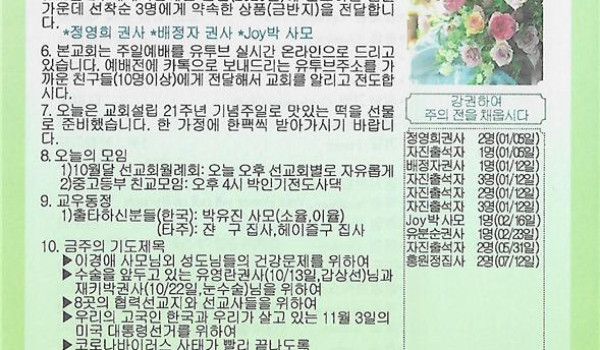 10/11/20 주일 교회 소식