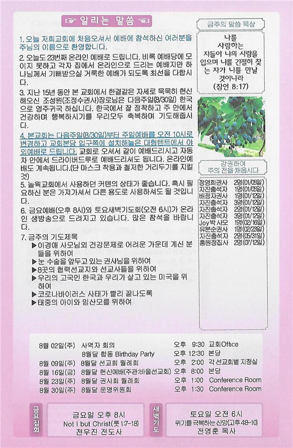 08/23/20 주일 교회 소식 페이지 정보 작성자 댓글 0건 조회 2,629회 작성일 20-08-23 07:50 목록 본문 이전글08/30/20 주일 교회 소식 20.08.29 다음글08/16/20 주일 교회 소식 20.08.15 댓글 0 댓글목록 등록된 댓글이 없습니다. 목록
