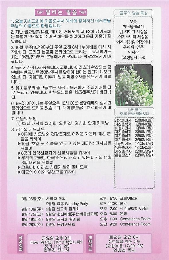 09/20/20 주일 교회 소식 페이지 정보 작성자 댓글 0건 조회 2,511회 작성일 20-09-19 15:14 목록 본문 이전글09/27/20 주일 교회 소식 20.09.26 다음글09/13/20 주일 교회 소식 20.09.12 댓글 0 댓글목록 등록된 댓글이 없습니다. 목록