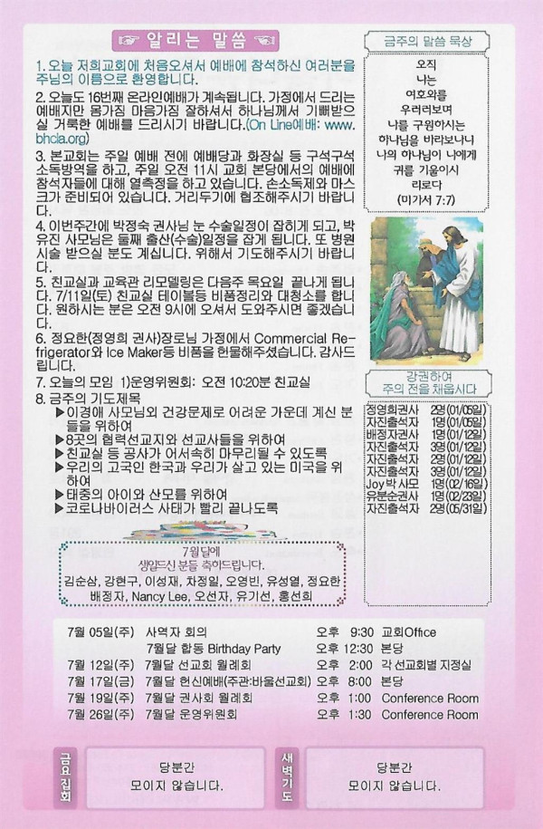 07/05/20 주일 교회 소식 페이지 정보 작성자 댓글 0건 조회 2,638회 작성일 20-07-03 15:21 목록 본문 이전글07/12/20 주일 교회 소식 20.07.11 다음글06/28/20 주일 교회 소식 20.06.26 댓글 0 댓글목록 등록된 댓글이 없습니다. 목록